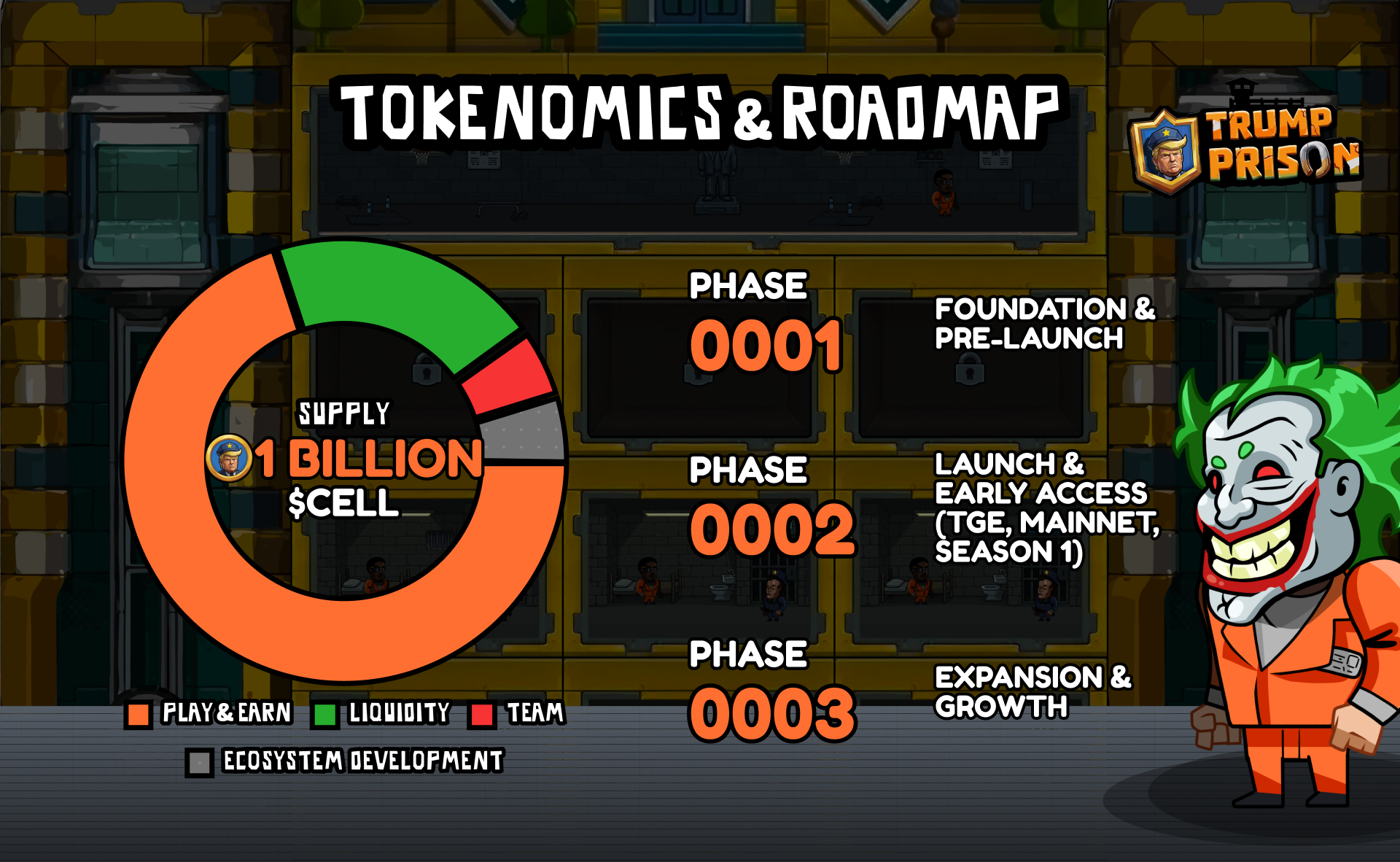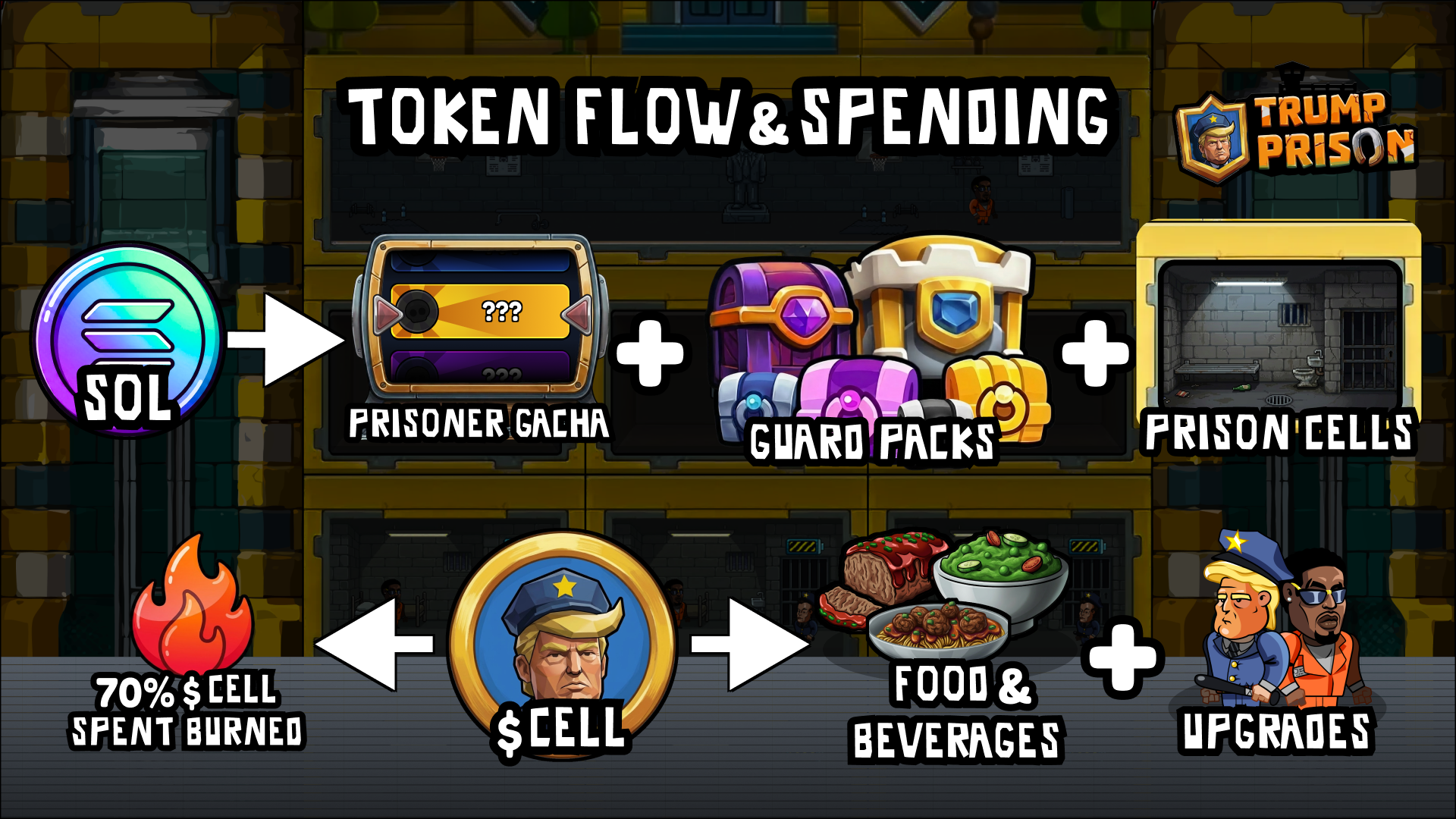 $CELL is the core utility token of Trump Prison. It regulates the in-game economic flow through controlled emissions, burn mechanisms, and recurring operational costs.
